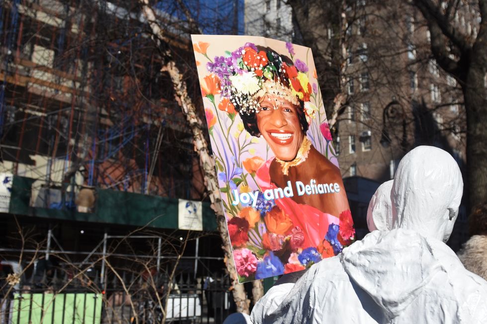 A sign honoring transgender activist Marsha P. Johnson at the "No LGB Without T" Protest
