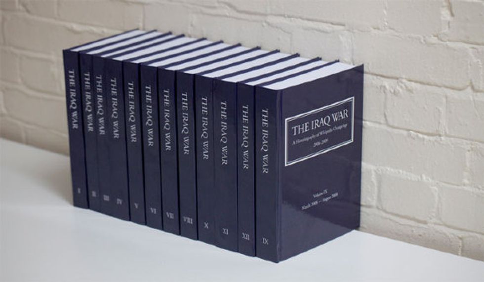 James Bridle, a veteran and observer of the publishing industry, has published every edit to the Wikipedia entry for the Iraq War, from the article's creation in December of 2004 to November 2009, as a twelve-volume set.