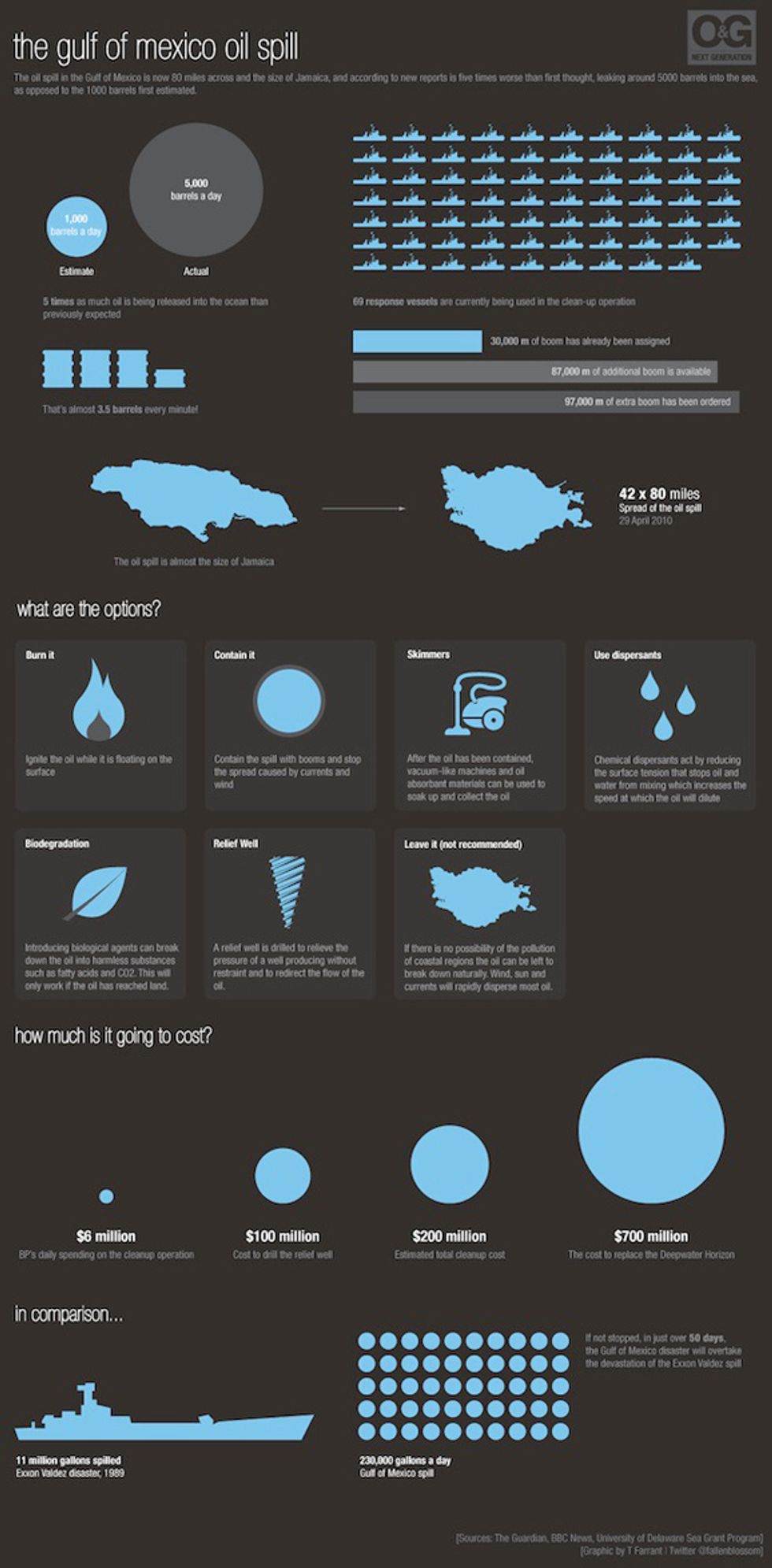 It's just hard to know what to say about this tragedy. This infographic (larger version here) starts to put it in perspective. The numbers are staggering. This spill will be larger than the infamous Exxon Valdez spill in 50 days, and it's estimated it could take up to 90 days to stop the flow of oil.