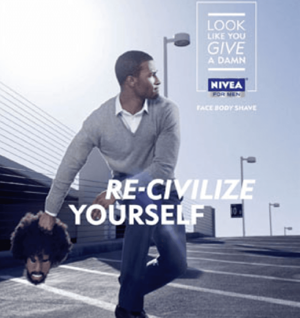 Nivea must have a serious lack of diversity on their marketing team, because there is no other explanation for why an ad like this got approved. The ad (see full image here) features a preppy, groomed black man holding the head of his former self, who's sporting a beard, an afro, and a pissed-off expression. The words "Re-civilize Yourself" are scrawled across the image, with the smaller phrase "Look like you give a damn" on top. The message couldn't be clearer: natural hair on a black man isn't a style preference or a nod to afrocentrism—it's straight-up uncivilized.