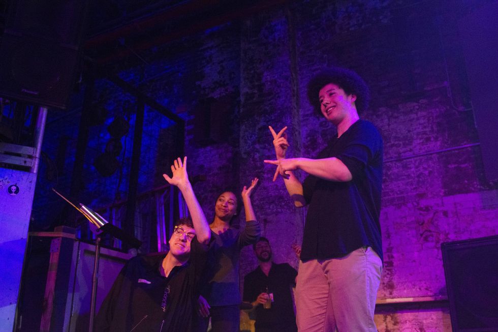 It's March 2025 and another Stand Up NYC show is upon us. It’s a little after 5 p.m. on Sunday, March 30 when Julie and Aaron arrive at 3 Dollar Bill in Brooklyn. There’s a long night ahead of them as co-producers of their latest show, which is set to start at 7 p.m. (or thereabouts). In a short black wig and long lashes, Julie’s eyes glimmer. She wears a black cocktail dress and boots, and it’s time to get to work. Julie, who carries herself with an energy and grace not unlike Diahann Carroll or Audrey Hepburn, works on the show’s tech in the DJ booth, carries a ladder, arranges seats, discusses the event with Aaron and co-host Mariyea, and greets everyone who’s volunteering that day with genuine gratitude accompanied by a hug or a loving handshake. She knows people don’t have to show up the way they do.