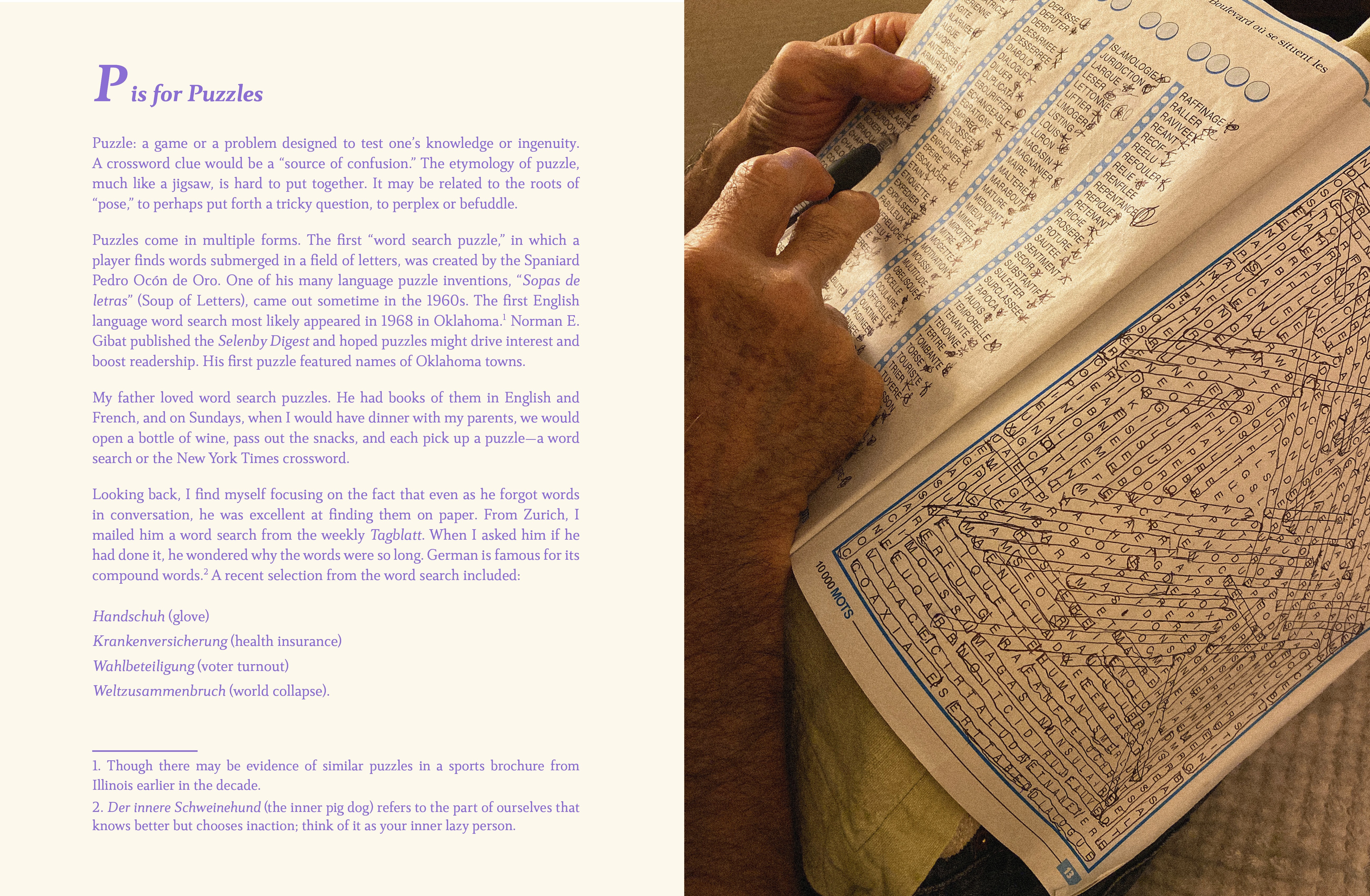 I’ve been working in book format for a number of years now. When we got the diagnosis, I was writing in my own journal to come to terms with it, but also making notes about how he’s switching onions and lemons and sand and snow–I thought there was something beautiful and interesting about that. When he died, then it was a way to process his dementia diagnosis, the grief of losing a parent, and not being there when it happened. I had also been researching dementia in general. I wondered if I could share this information because I was so interested in these themes of language: this forgetting, but also this replacement of finding something when a word didn’t exist. When my father was still alive, he would forget something or be unable to place a word or term or and I realized I was doing that as I tried to learn German. There was something here and I wanted to talk about it.