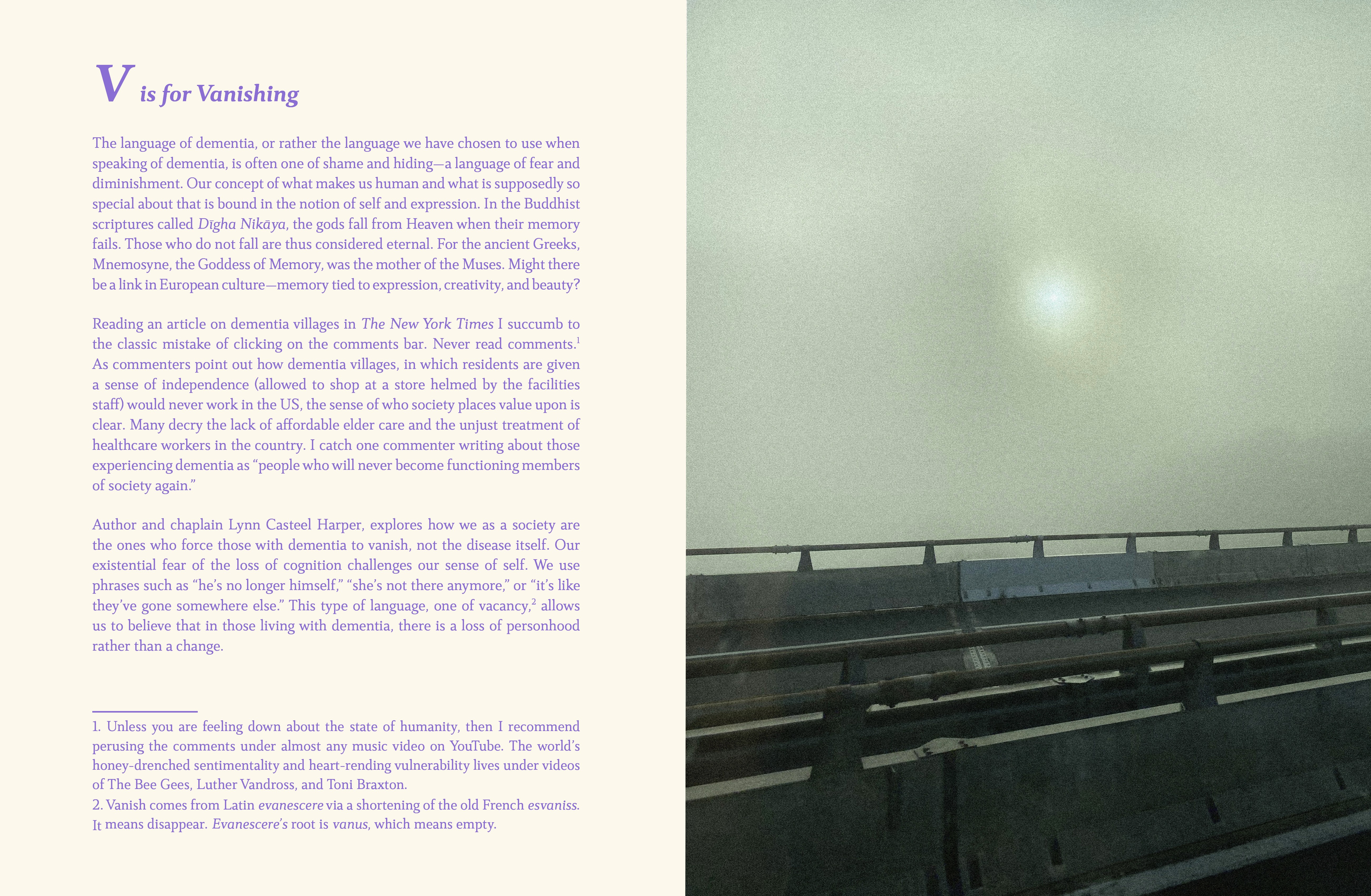 When I told people about my father’s dementia, their immediate response was always really extreme, that it must be the most horrible thing. “Does he know who you are?” I realized most people’s idea of dementia is shaped by media where it is this horrific, frightful experience, and it is, and it can be, but there’s a lot that comes before that. I wanted to respond to that, to my own experience and my father’s experience and try to figure out things for myself. I went back to these lists of words I was jotting down–he stopped saying salad and said leaves, and then he lost leaves, and it was paper. There was something about that that was kind of childlike, and that is how I came down to this alphabet guide. I thought this was a great way to introduce these various topics, to link these episodes and essays to make it a bit more approachable and talk about something difficult. I wanted to work with a non-linear narrative because that was how my father was experiencing things.