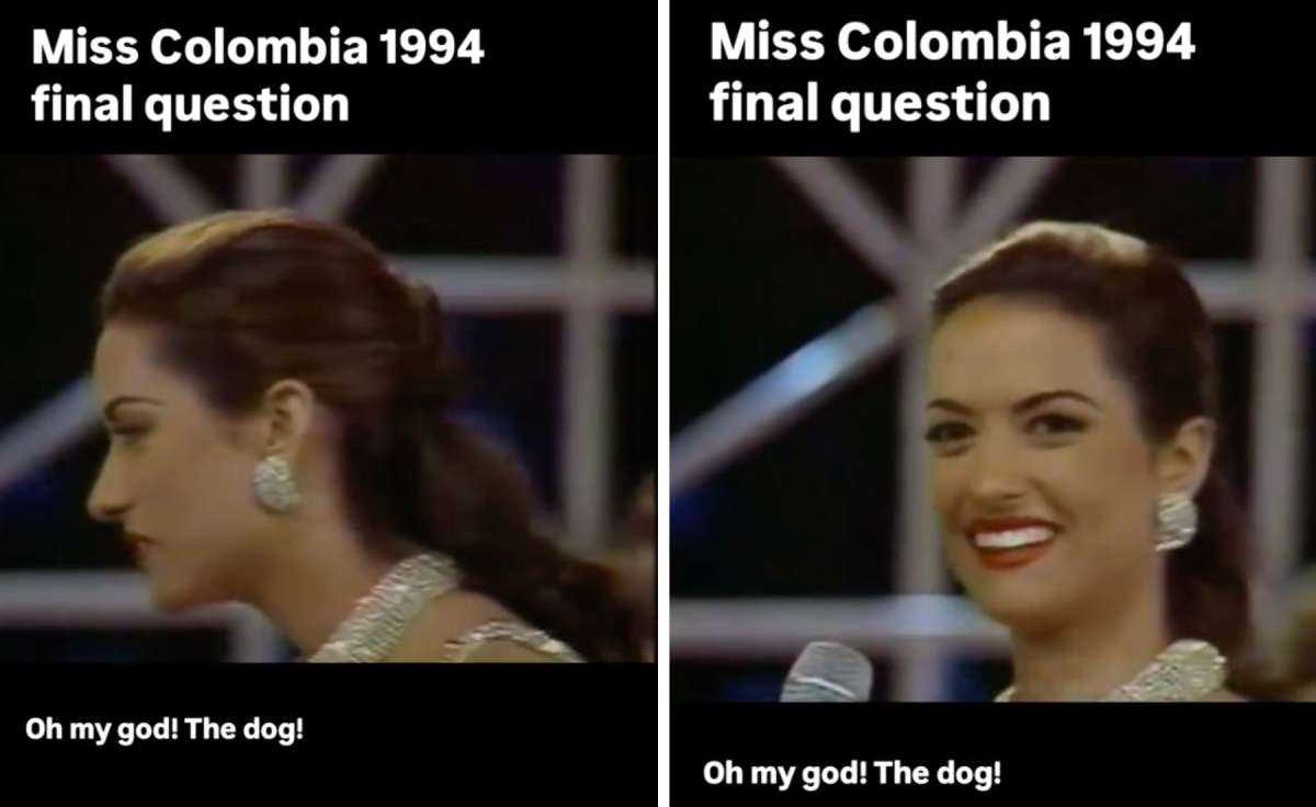 The final question for Miss Colombia 1994 went, "What would you save from a museum on fire: famous paintings or the guard dog?" The woman patiently listened to the whole question before exclaiming in surprise, "Oh my god! The dog!" She laughed a little before explaining her choice: "The paintings are art, and art is to be given away like love or like peace." She added, "Animals, plants, and people are life, and life is to be kept."