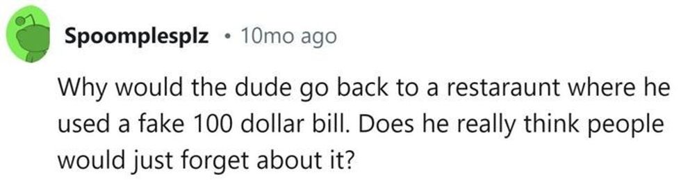 With the fake $100 bill tucked in their pocket, the server approached the table. “I get to their table and they instantly recognize me, the woman seemed normal but the guy looked like he was nervous. I pretended nothing happened all the way until I got their check,” the server described.