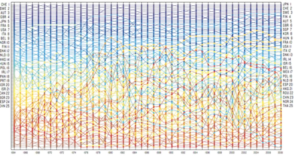 The atlas starts with the idea that the wealth and potential of nations is derived from productive knowledge. To maximize collective knowledge, a nation needs to connect its individual citizens, each of whom can benefit the whole. The more complex and interconnected a nation, the greater its economic productivity and potential. The atlas visualizes the economic complexity of 128 countries and foresees the expected GDP growth for each between 2009 and 2020, using what Hausmann and Hidalgo call the Index of Economic Complexity. Producing a wide variety of goods boosts a nation's rank on the ECI because it gives the country the potential to make even more (and more advanced) products. For example, a country that manufactures lithium batteries can soon expand into making computers, cell phones, or electric cars.
