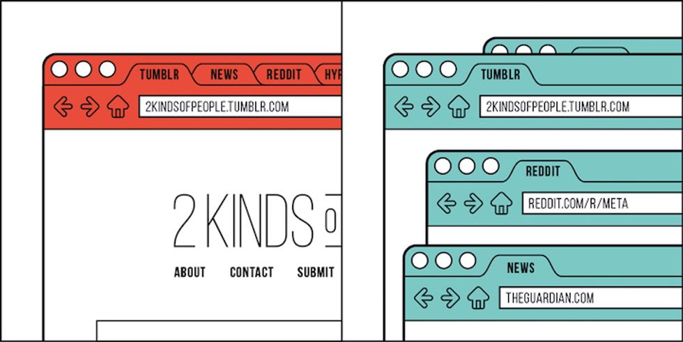2 Kinds of People is a great Tumblr that shows simple yet different ways people like to do everyday things. From how you name your Wi-Fi network to how you cut a sandwich, every one of these illustrated comparisons is sure to make you choose one side over the other. The clever illustrations are the work of a Lisbon-based art director, João Rocha, who goes by the Twitter handle @inoffensive, and whether you're looking at this on your laptop or your phone, you're sure to spot which kind of person you are.
