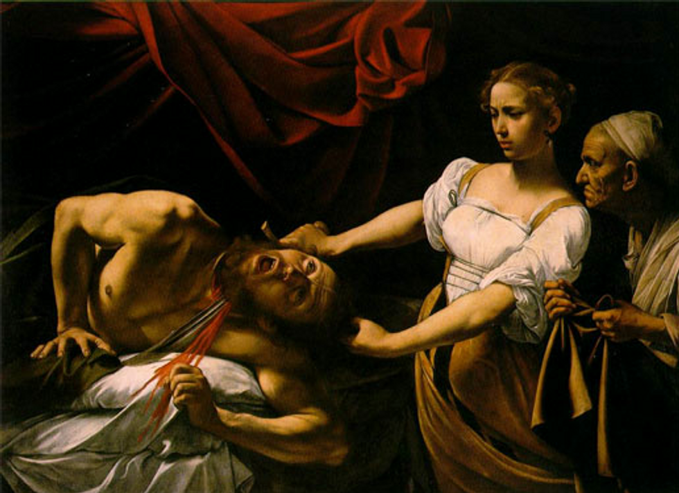 No. This is what she’s looking at: the man she’s beheading. The image comes from the painting, “Judith Beheading Holofernes,” by the artist Michelangelo Merisi da Caravaggio (known simply as Caravaggio) in 1599. Judith, seen above, is not making an al dente delight. Judith is cutting off some dude’s head.