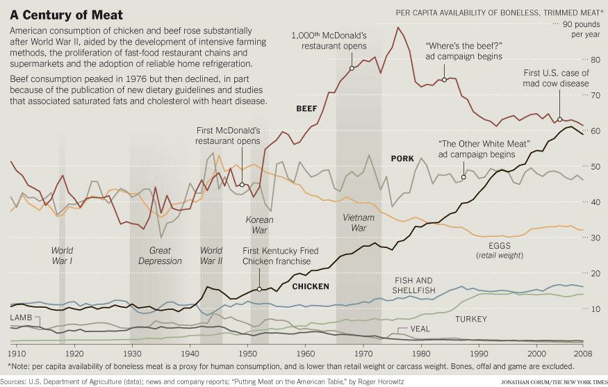 The big story is the explosive chicken boom and the corresponding beef decline. Interestingly, this is reflected in their frequency in the written word, as we discovered in our Google N-gram survey of the American diet back in December. Turkey has also benefited from the white meat craze, while veal and eggs have lost ground, victims of animal welfare and anti-cholesterol campaigns respectively, I suspect.