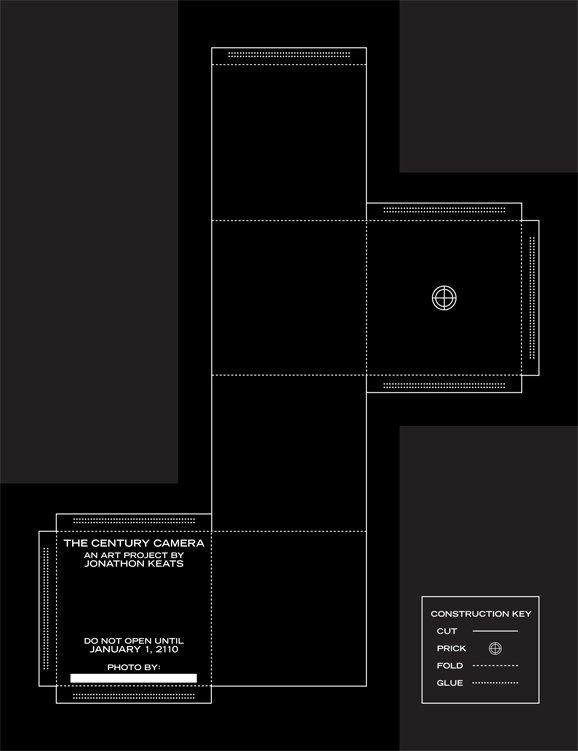 The Century Camera appears in GOOD Issue 18, which is on newsstands now. While you can try printing your pinhole camera at home on a color inkjet or laser printer-make sure you print it double-sided, as you need both sides to make it work-the thicker ink of a printing press will probably give you better results over the next century or so. We recommend you go pick up a copy of GOOD Issue 18: The Slow Issue. But, if you want to give it a go, here's a PDF version of the page from the magazine.As you flip to the next page, rip it out. Cut, prick, fold, glue. You've just constructed a pinhole camera that will take a single picture with a 100-year-long exposure. Since you'll need to fix the camera in the same position until 2110, find a place that matters to you enough to document the next century of change (it will still work if you move it, the image will just be more abstract). It doesn't have to be an endangered rainforest. It could be your own neighborhood.This camera is a simple instrument. The pinhole lets in a little light each day, focusing it on the black ink at the back of the box. The ink will gradually fade as light streams into the camera, preserving a unique positive print of the illuminated landscape. Nothing fast-paced will be captured-neither people nor machines-but transformations over decades will register as shades of ghostly gray, and whatever remains constant will look as sharp as it would in an instantaneous snapshot.You may not be around to see the results of your work. But if your children watch over it and protect it from the elements, and if your camera weathers the next hundred years, then your grandchildren will receive a revealing inheritance. What's more, the following generation of GOOD readers will have the opportunity to view the image you've made in a special folio that the editors have committed to printing in 2110.In the meantime, you may come across cameras set up by other readers. They might be encountered anywhere, or rest unobserved for the whole hundred years, thousands of black-box time capsules collectively witnessing our world in transition.